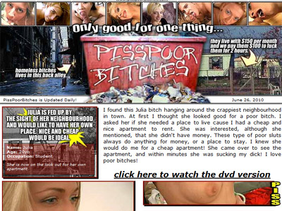 Piss Poor Bitches is a little confusing - the name makes it sound like a watersports site, but it isn't. Instead it's just a hardcore site. Here there's a twist, though. All of the models are real amateurs that are broke or homeless or both. They're desperate for money and willing to trade their bodies for some greenbacks. The lads running the site oblige them with a trade.