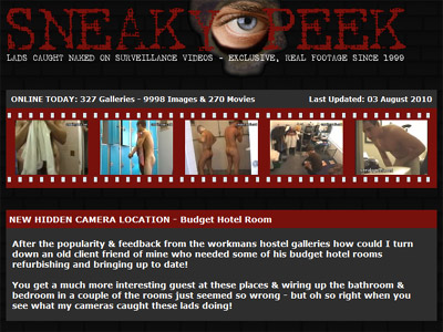 Sneaky Peek is the passion of its nameless host, who goes about the UK setting up tiny hidden cameras in locker rooms, clinic rooms, bedrooms, bathrooms and anywhere else he thinks he can catch some hot studs naked and unknowing. The tour page actually has a video showing you how he sets the cams up and runs the whole operation, which is pretty neat to say the least. He's done a good job choosing locations and capturing things on tape, and has been very clever in where and how he's put in the cameras. You'll see his hot neighbor wanking and banging his girlfriend, middle age police officers stripping down in their locker rooms after work, football teams coming in off the pitch to change and shower, lads pissing in public urinals or soaping up in a hotel or hostel shower... it's pretty endless, and it all feels very real.