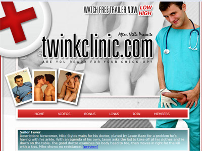 Twink Clinic offers just the sort of gay porn you'd expect it to. All of the scenes are filmed in doctors offices, examination rooms or the doctor's lounge area of the clinic and every scene stars a gorgeous twink or, as is typically the case, two handsome twinks. Young interns and male nurses check the vitals on handsome sailors and college studs more thoroughly than most, making sure their lungs sound good, their eyes are clear and their cocks are hard. You'll see them sucking and stroking one another after the 'acting' that sets the scenario, and then hard ass penetration followed by messy cum shots and facials. The lads here play it safe when their deep inside each other, but for the finale they whip off that latex skin and let their cum rain down on their handsome fuck buddies.